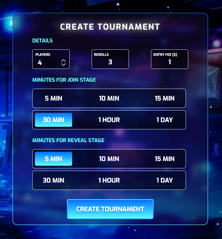 All players can create their own custom tournaments by clicking the "Create" button on the lobby page. When creating a custom tournament, players have more control over the number of players that can enter, number of rerolls, entry fee, countdown to join, and countdown to reveal.